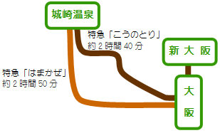 大阪から城崎温泉へ行くには、使える特急電車が2つありますけど、どっちも1本で乗りかえなしで行けます。大阪から城崎温泉まで、2時間40~50分くらいです。